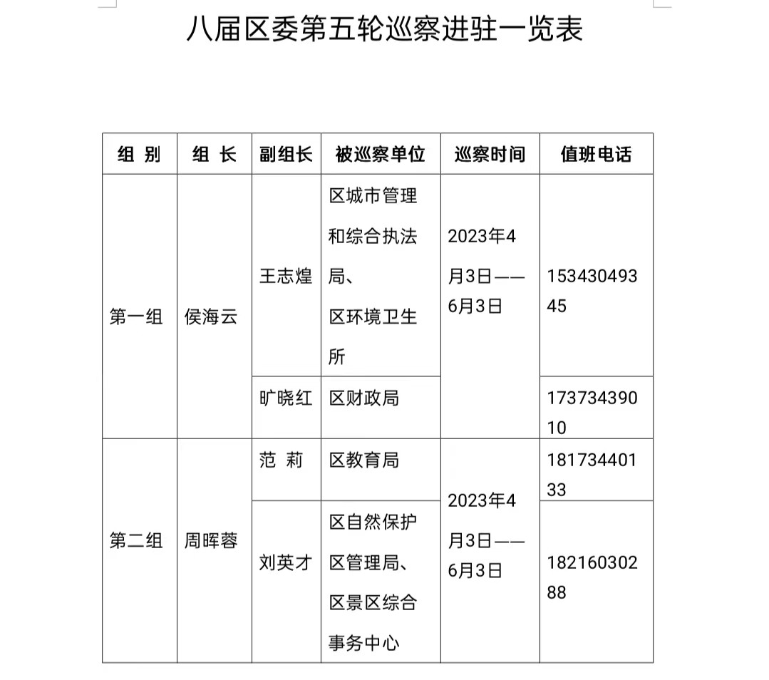 根据安排,区委巡察组将在被巡察单位工作2个月左右。巡察期间设专门值班电话和举报信箱。根据巡察规定,区委巡察组主要受理反映被巡察单位党组织领导班子及其成员、下一级党组织主要负责人和重要岗位负责人问题的来信、来电、来访,重点是关于违反政治纪律、组织纪律、廉洁纪律、群众纪律、工作纪律和生活纪律等方面的举报和反映。