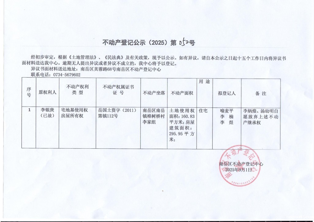 不动产登记继承公示(2025)第052号 喻麦平、李楠、李煜