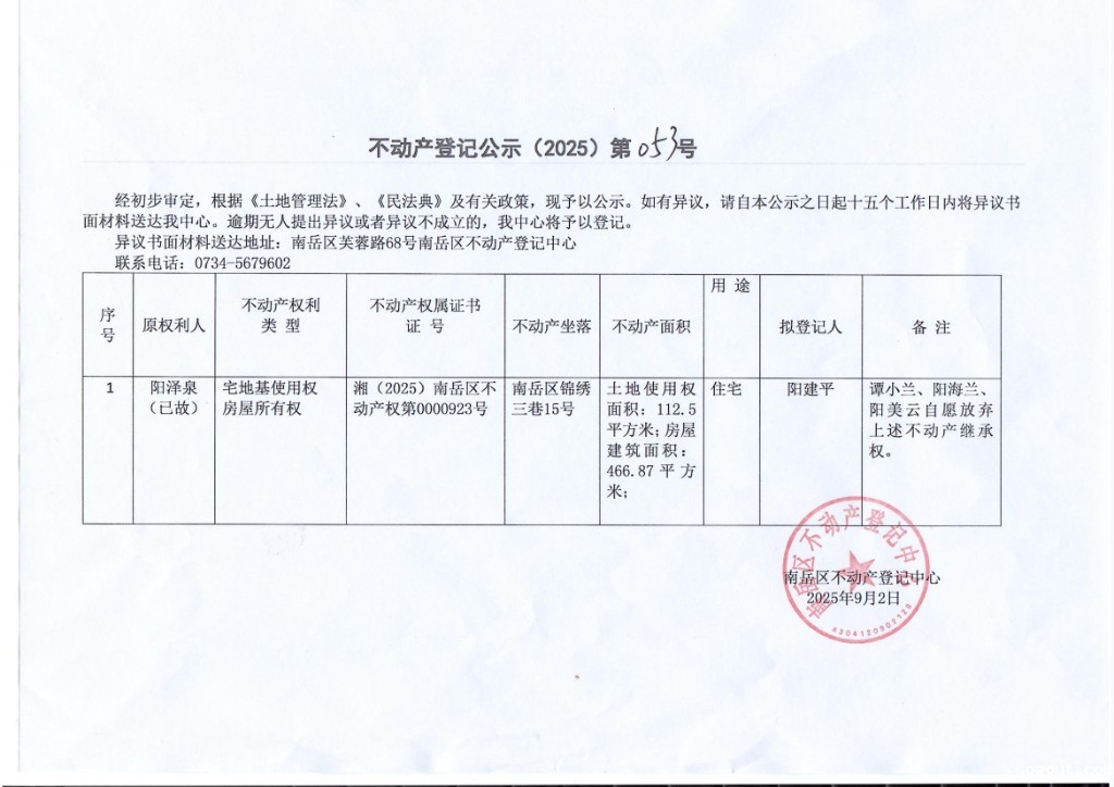 不动产登记公示(2025)第053号 阳建平