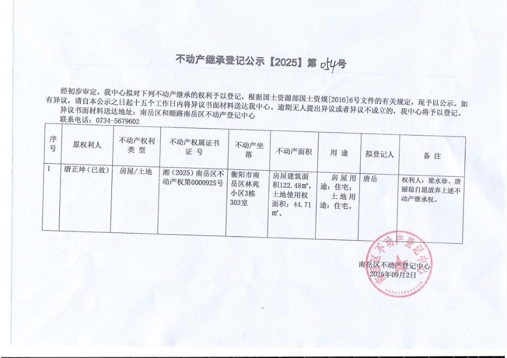 不动产继承登记公示【2025】第054号 唐岳