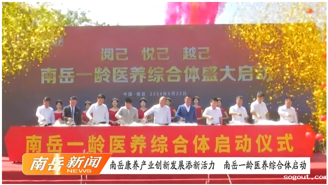 现场,刘越高等领导及嘉宾共同将寓意健康美好的泉水注入启动台,共同启动南岳一龄医养综合体。