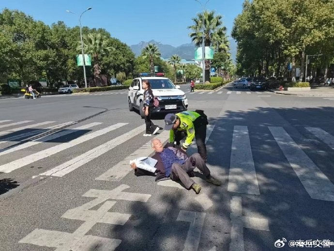 近日,衡阳南岳交警在路面巡逻时发现一位老人横躺在马路上。民警立即下车查看,原来是老人不慎摔倒,意识清醒,自己不能站立。