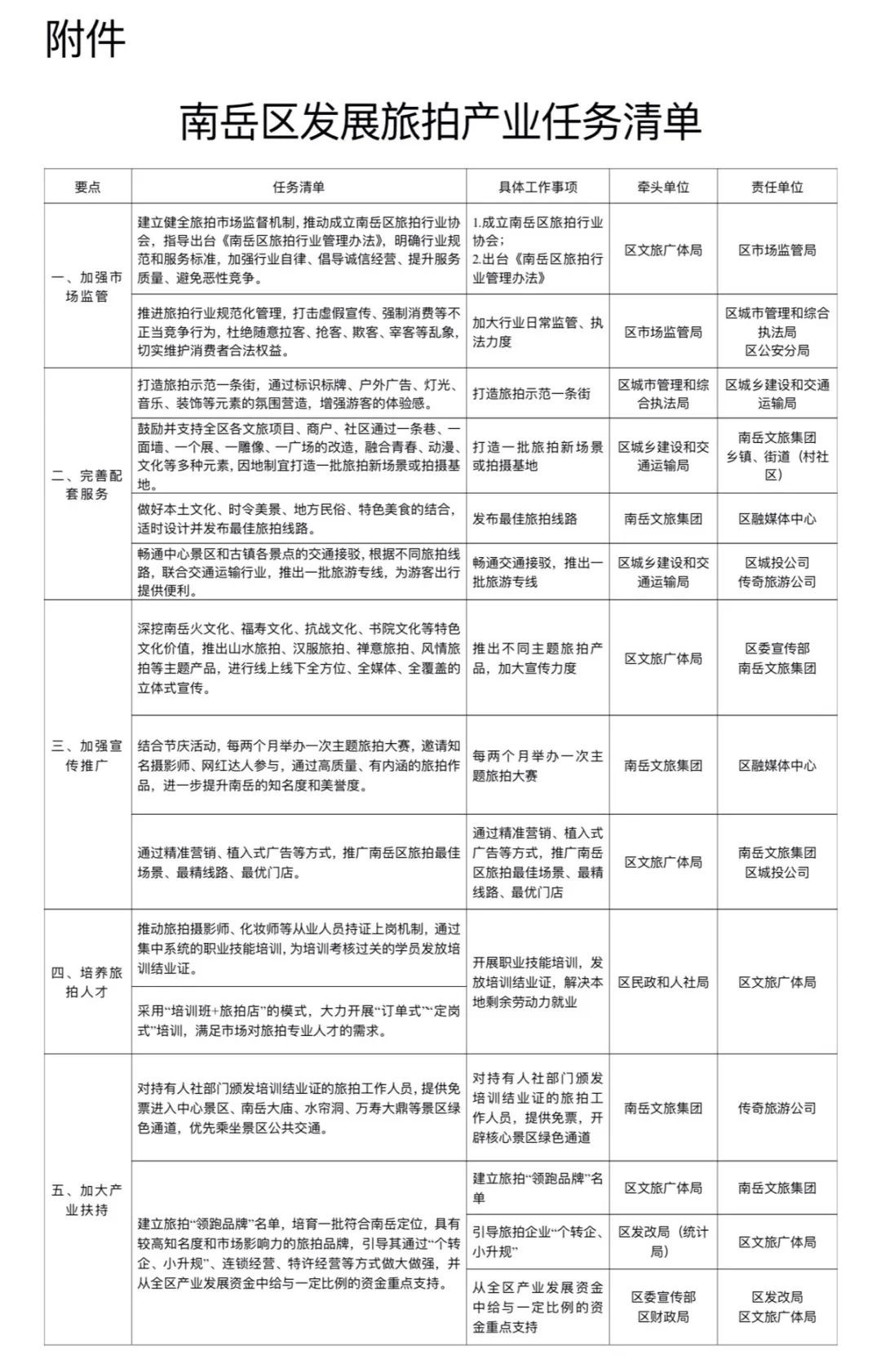 五、加大产业扶持。对持有人社部门颁发培训结业证的旅拍工作人员,提供免票进入中心景区、南岳大庙、水帘洞、万寿大鼎等景区绿色通道,优先乘坐景区公共交通。建立旅拍"领跑品牌"名单,培育一批符合南岳定位,具有较高知名度和市场影响力的旅拍品牌,引导其通过"个转企、小升规"、连锁经营、特许经营等方式做大做强,并从全区产业发展资金中给与一定比例的资金重点支持。(牵头单位:区文旅广体局;责任单位:区委宣传部、区发改局、区财政局、南岳文旅集团、传奇旅游公司)本措施自发布之日起施行,试行两年。
