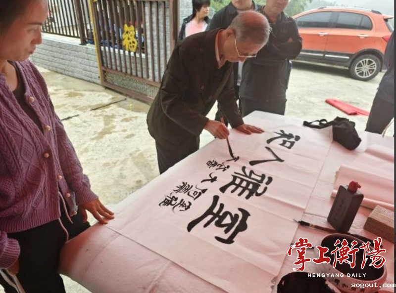 一旁,南岳书法家协会的书法家们为老人们带来"送书画进乡村"活动,铺纸、蘸墨、起笔……书法家们笔走龙蛇、挥毫泼墨,以字抒情、以墨沁心,留下一幅幅灵动飘逸、墨韵溢香的书法作品,尽展中国传统文化的魅力与韵味。
