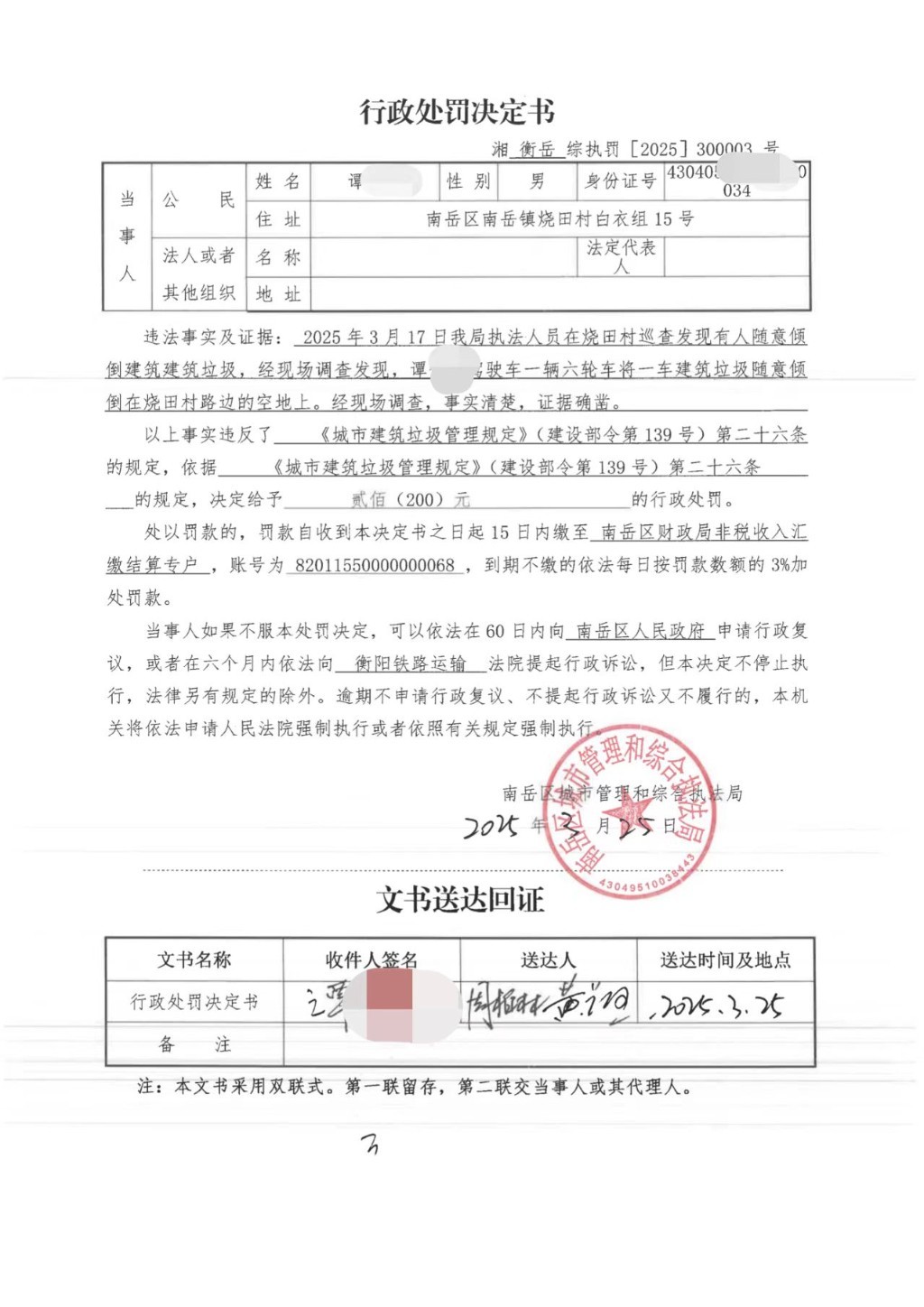 2025年3月17日,雷竞技游戏平台特色城市管理和综合执法局渣土中队的队员发现谭某某在雷竞技游戏平台特色烧田村随意倾倒建筑垃圾,依据《城市建筑垃圾管理规定》第二十六条的规定,谭某某被依法查处。