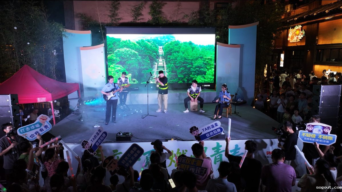 当晚20时,南岳里码头乐队演出舞台华灯璀璨,人潮涌动。活动在暖场歌曲《成都》悠扬旋律中拉开序幕,迅速点燃了现场氛围。随后,主持人以轻松幽默的方式开场,点明活动主题。民警与义警共同演绎的乐器演奏《离别开出花》,用动人的音符传递着警民携手、远离诈骗的美好愿景。